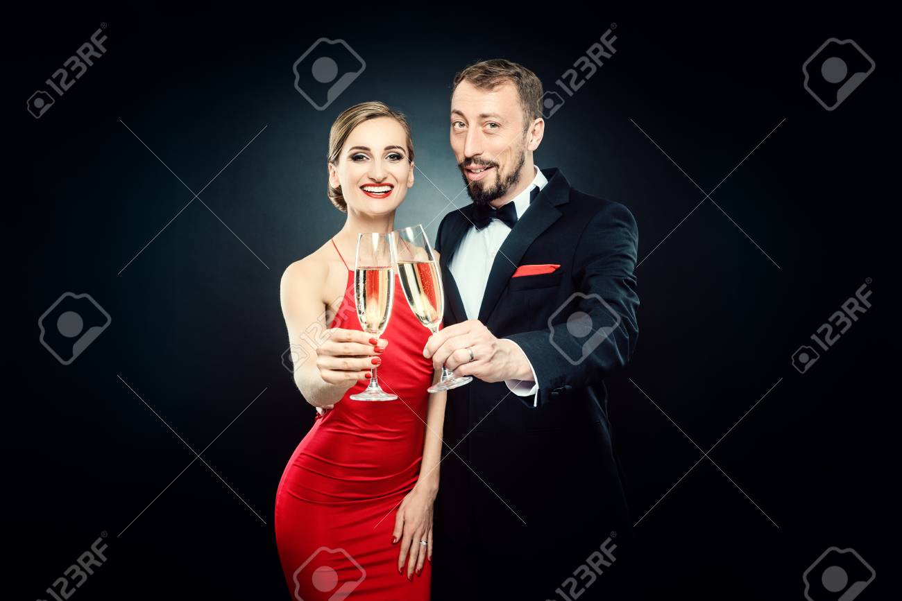 Elegant Woman And Man Clinking Glasses On Glamourous Party Wearing