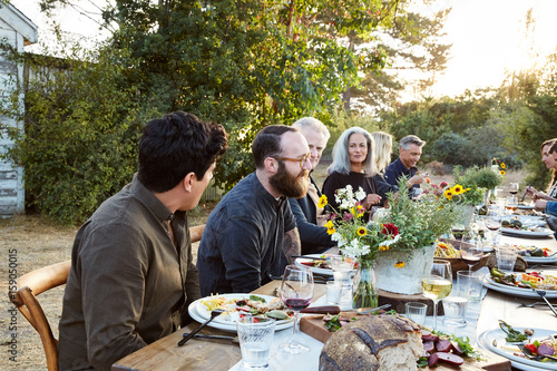 Group Of Friends Enjoying A Farm To Table Dinner Party In Backyard