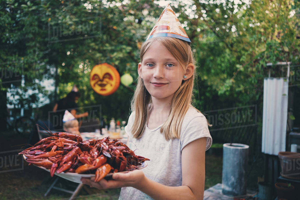 Portrait Of Girl Holding Plate With Cooked Crayfish At Garden