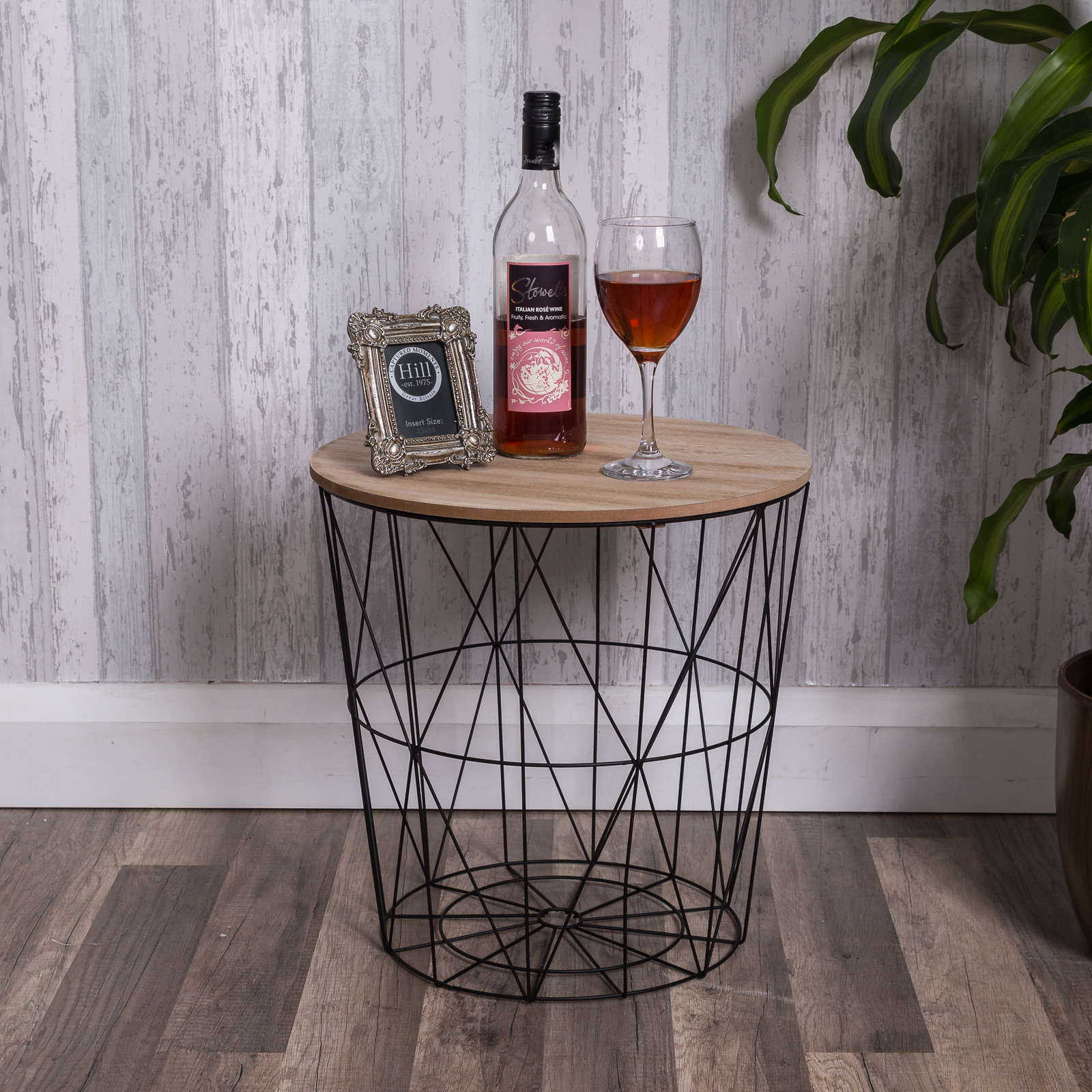 Retro Black Metal Wire Round Wood Top Storage Side Table Basket