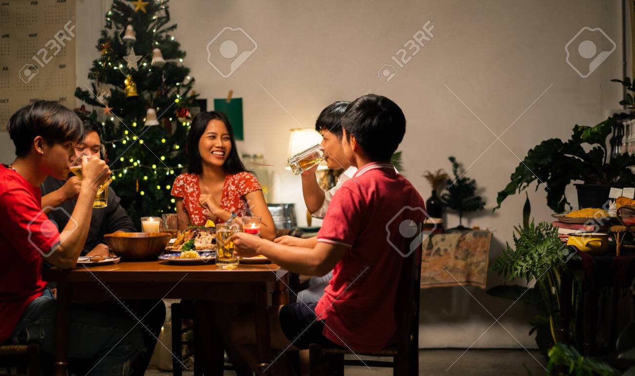 Group Of Asian People Have A Dinner Party And Beer At Home Stock
