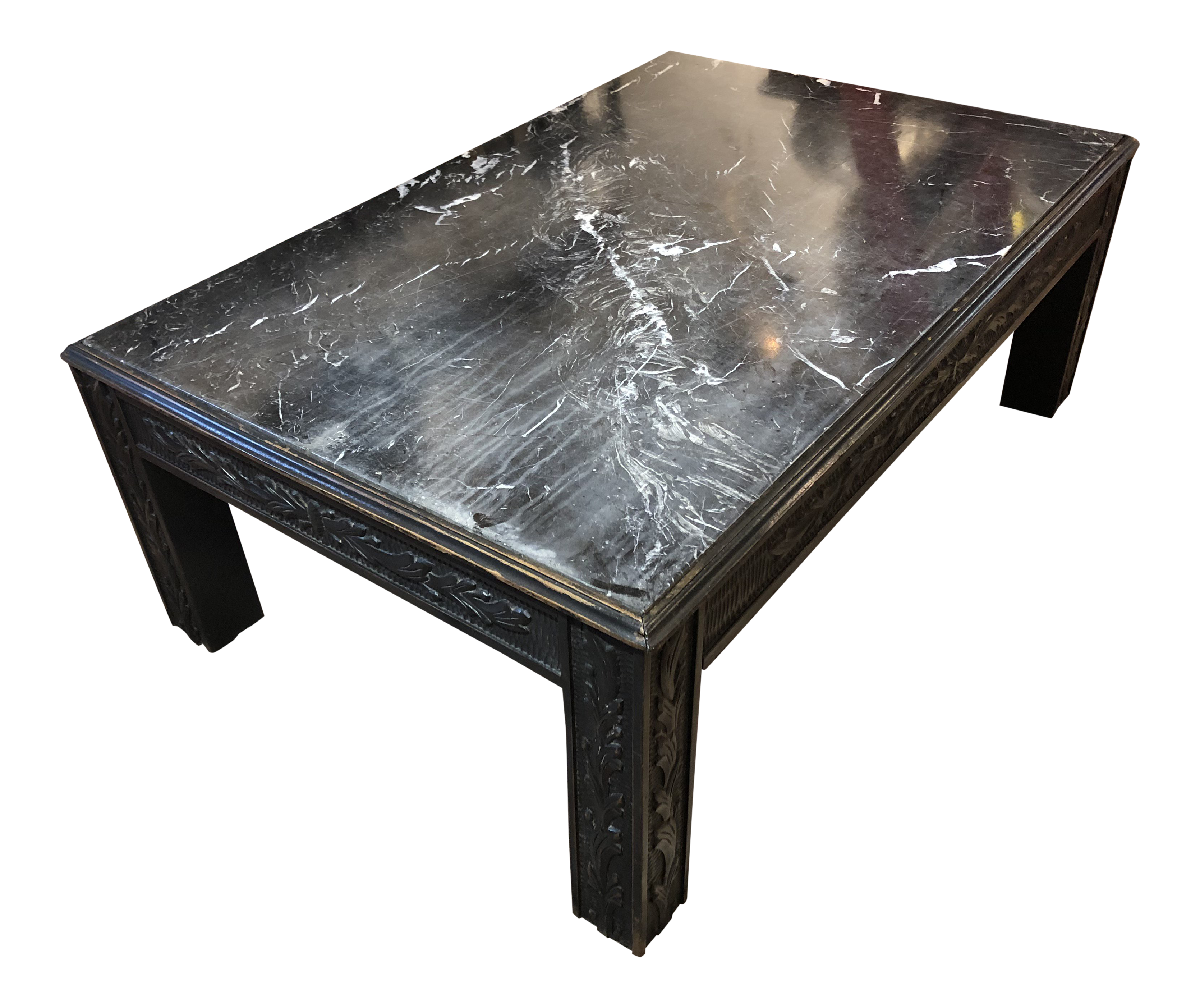 Black Marble Top Cocktail Table With Distressed Carved Wooden Base