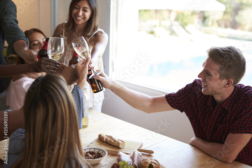 Five Friends Make A Toast At A Dinner Party In The Kitchen Buy
