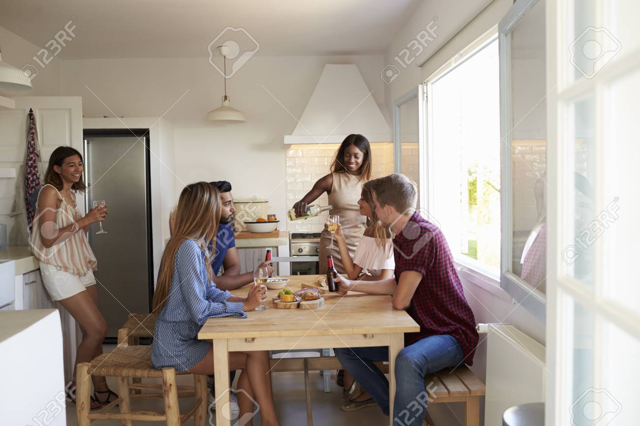 Six Adult Friends In The Kitchen At A Casual Dinner Party Stock