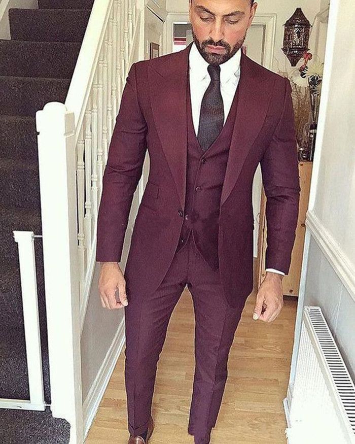 New High Quality One Button Burgundy Wedding Groom Tuxedos Peak