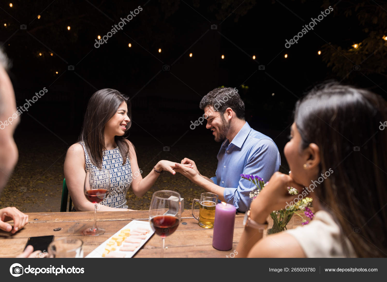 Young Man Putting Ring Girlfriend Finger Dinner Party Friends